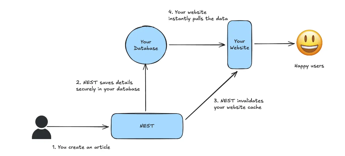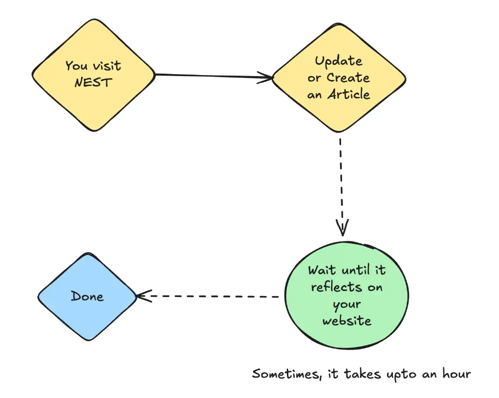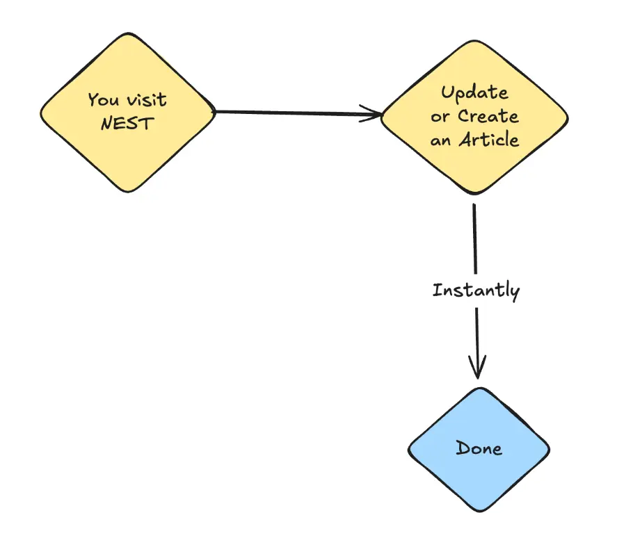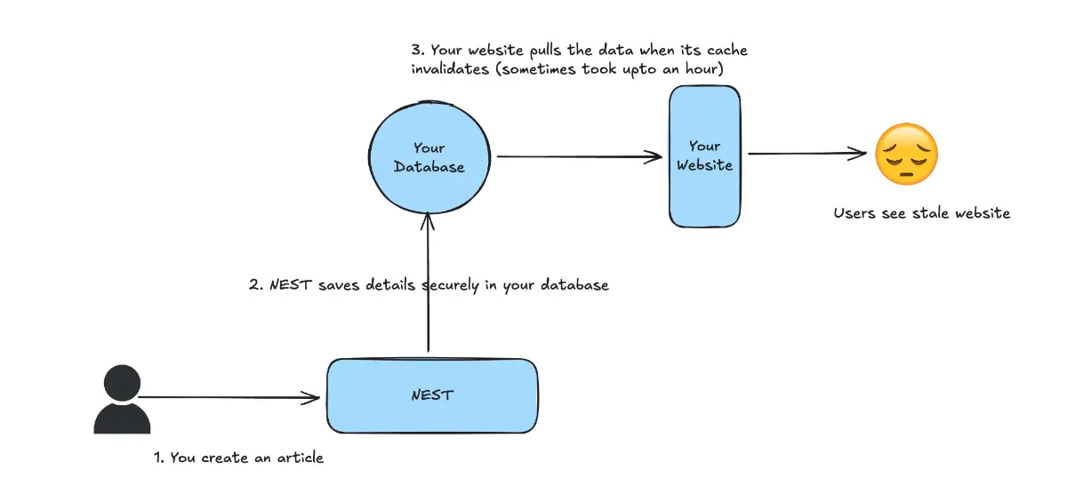 To understand this better, it helps to look at how things worked internally earlier. When you created or updated content, NEST would store everything securely in your database. Your website, however, was optimized to serve cached pages. It would only fetch fresh data once its cache invalidated naturally, which could sometimes take a long time. During this window, users could end up seeing stale content even though the latest version already existed.