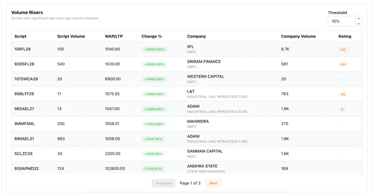 If a bond trades on both NSE and BSE on the same day, we merge volumes