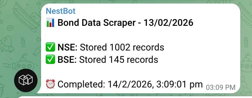 It pulls corporate bond trading data from both NSE and BSE. It parses the files. It stores trades in a Supabase database table.