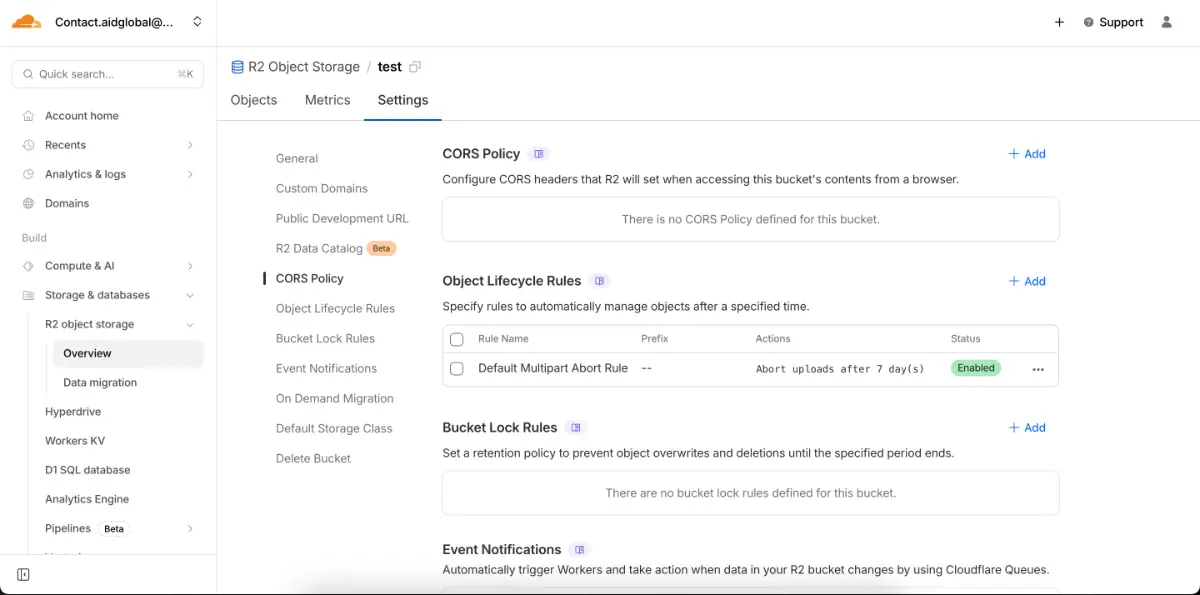We need to be able to upload the images directly from your browser into your R2 bucket. So we need to setup this CORS permissions to tell the browser to allow the uploads from NEST's user. To allow this, Go to your bucket settings > CORS Policy > Add, and add the following policy.