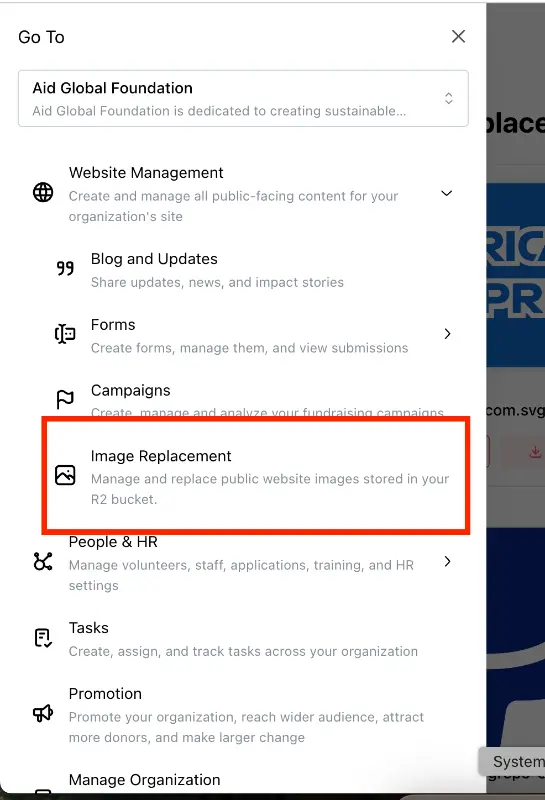 The Image Replacement Dashboard within NEST is built to make website management easier for non profits that do not want to depend on developers for every small change. Once your Cloudflare account is connected, this feature lets you update images on your website directly from NEST in a few clicks.